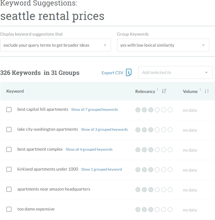 Naturally, we get back a list of related but sometimes very similar keywords. Even in this list, we can start to see some interesting variations ("average rent", prices by year, mapped prices, etc.), but let's take it to step two and group these keywords: