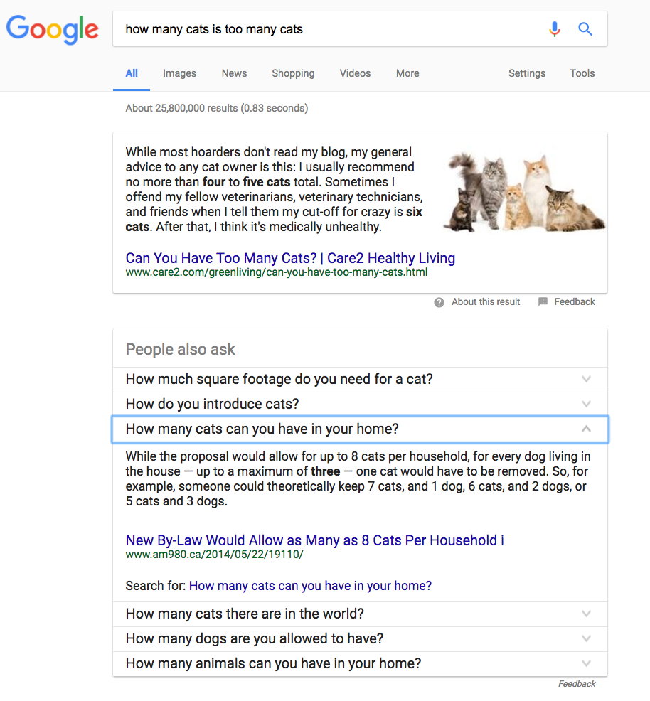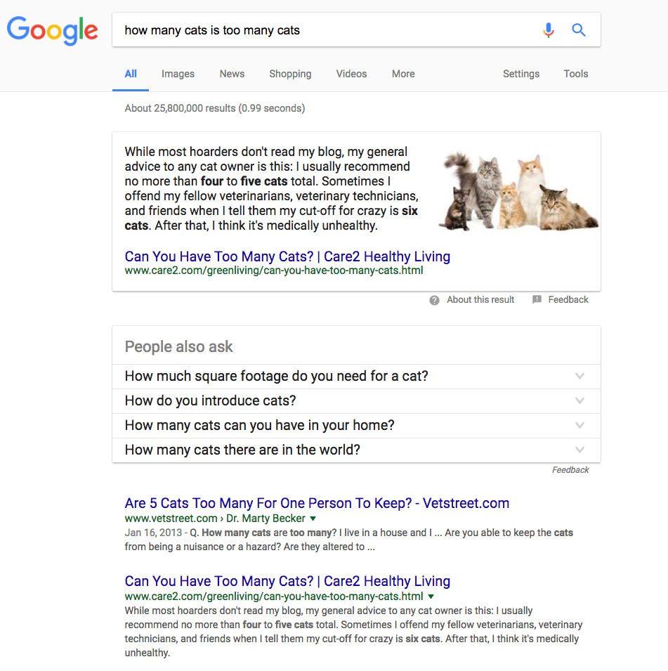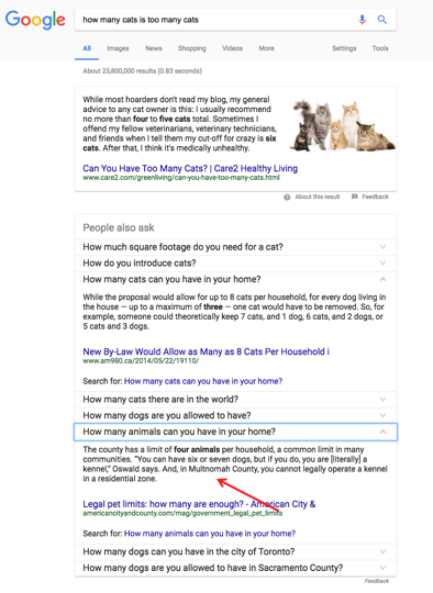 Every “People also ask” suggestion is a featured snippet. As you dig deeper into the topic by selecting one “People also ask” after another, keep an eye out for featured snippets that are not particularly helpful. This is the search engine attempting to generate a simple answer to a question and not quite hitting the mark. These present an opportunity. Keep track of the ones you think could be improved. In the following example, we see the Featured Snippet being generated by an article that doesn’t fully answer the question for an average user.