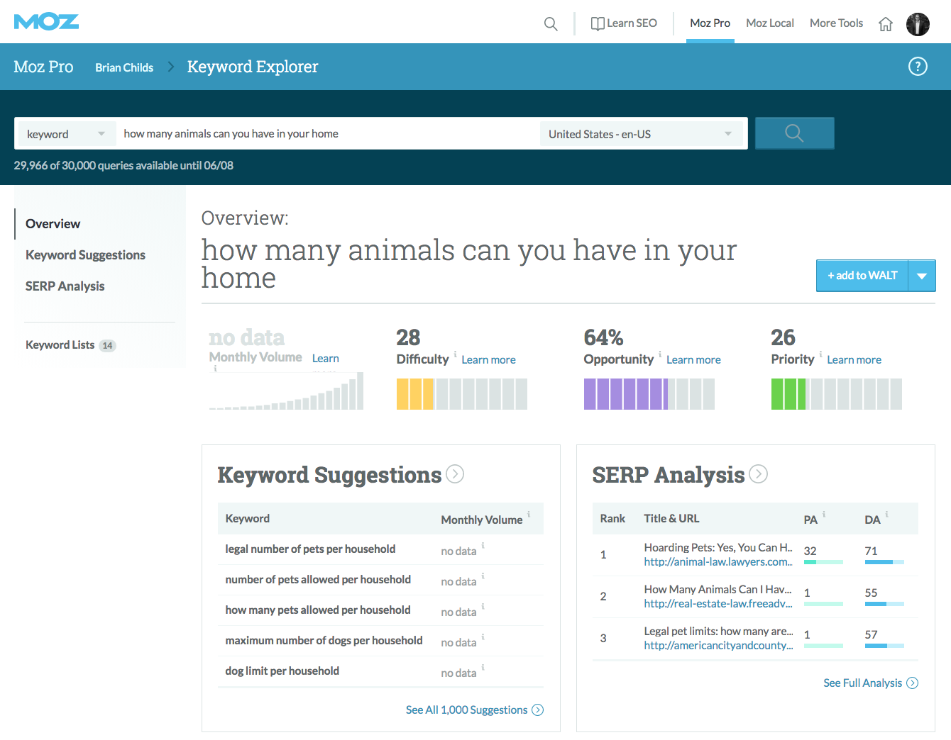 I can then find variants of these niche topics using Keyword Explorer or another tool, looking for the keywords with the best qualities (Difficulty, Search Volume, Opportunity, etc).