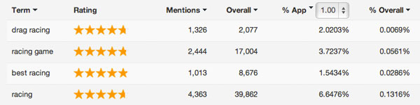 This can be done manually in iTunes for free. Simply open iTunes, find an app that you want to investigate, then select "All Reviews." Now sort the ratings by "Most Favorable," then start scrolling. When you see a keyword or keyword phrase that looks interesting, just add it to your keyword idea list.