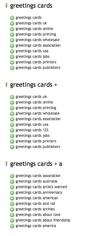 Übersuggest is a great tool that extracts all the Google autocomplete words for a base keyword. It is really simple to use. All you have to do is put your base keyword in the search box, select a language and country then hit suggest. For [greetings cards] we are presented with the following list of 352 suggestions:
