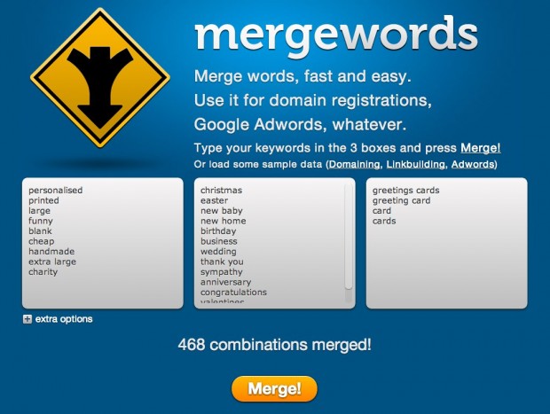 For this next stage, I like to use a tool called mergewords (mergewords.com) to further advance our list. Before you use this tool you will need to think carefully about how to arrange the words in the three columns to get the right combination of words. Once you have done this, you can start filling the boxes with words. For greetings cards, I used the following combination: