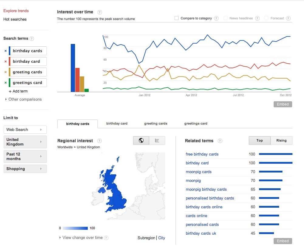 As you can see from the graph in the top, very slight changes in the keywords can produce drastically different results. Pluralising [birthday card] to [birthday cards] results in twice as much interest over the past 12 months.