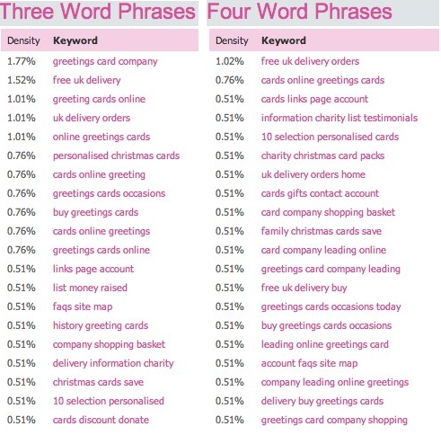 Now that you have an idea of who the big players are, it's time to see if we can find out what keywords they are targeting. Let’s take a look at greetingscards.co.uk. When we look at the home page, there doesn’t seem to be an awful lot of text, so let’s turn to using a keyword density tool. SEOBook has a pretty good keyword density tool but I’m going to use the tool from David Naylor Search Marketing. The reason I prefer to use this tool is because it has more options to customize your results and can provide phrases of four or more words in length. When we use the keyword density tool we are provided with the following list: