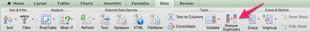 Having followed these steps, we now have a list of over 800 keywords. However, some of these may be duplicates and some may be unsuitable for other reasons. This is how I start the filtering process. First I input all of the keywords into an excel spreadsheet, then I use the ‘remove duplicates’ tool. I'm using Excel 2011 for Mac, which has a 'remove duplicates' function in the Ribbon's Data tab: