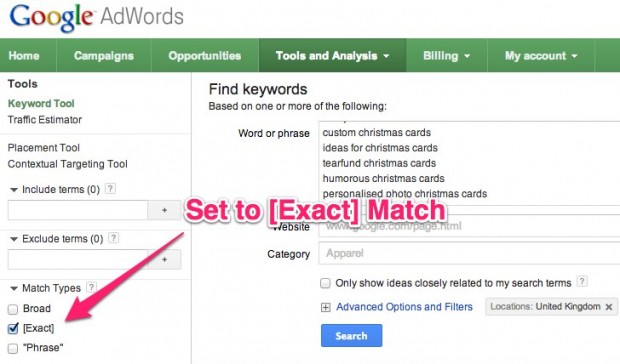 Now we have a list of 741 keywords, it’s time to use Google’s keyword tool to start refining the list and find out information such as search volumes, competition and local search trends. When using the tool, remember to have all the parameters set correctly. So, make sure you set the tool to [Exact] match types in the correct location (UK in this case) and tick the box to only show ideas closely related to your search. To set the tool to show [Exact] match, just navigate to the left sidebar and select the check-box next to [Exact]. You may have to unselect the check-box for Broad match if it is selected: