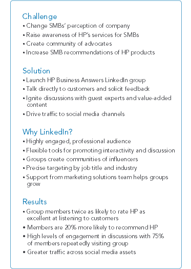 That is a summary of the HP case study provided by LinkedIn, which you can read in full here: http://marketing.linkedin.com/sites/default/files/pdfs/LinkedIn_HPUKCaseStudy2011.pdf. HP identified that their community and the demographic that they wanted to target were present on LinkedIn and so created a non-branded, general small business discussion group that allowed users to help one another out. Despite it being non-promotional, HP saw great results as a result of unaided brand awareness and the work that they had put into the community.