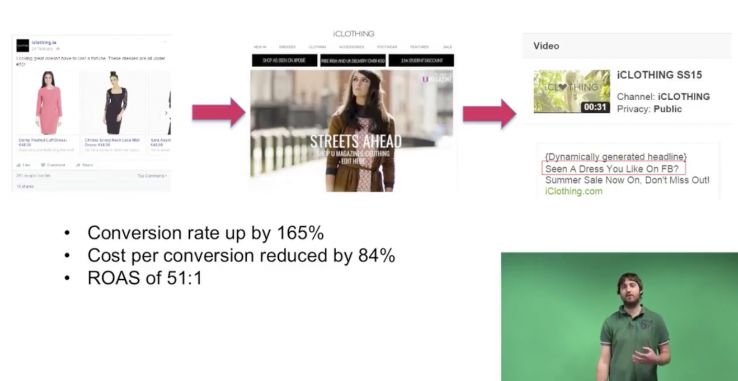 Our second case study comes from an online clothes retailer called iClothing. We manage their social accounts as well as their AdWords account, and could see that while social conversion rates were low, it was often a touchpoint on a user’s path to purchase. We created a list of users who had come to the iClothing website from one of our Facebook ads. Using this list within AdWords, we were able to show these users specific, Facebook-related ads encouraging them to return to the website to complete their purchase. This strategy allowed us to boost conversion rate by 165%, while reducing cost-per-sale by 84%.