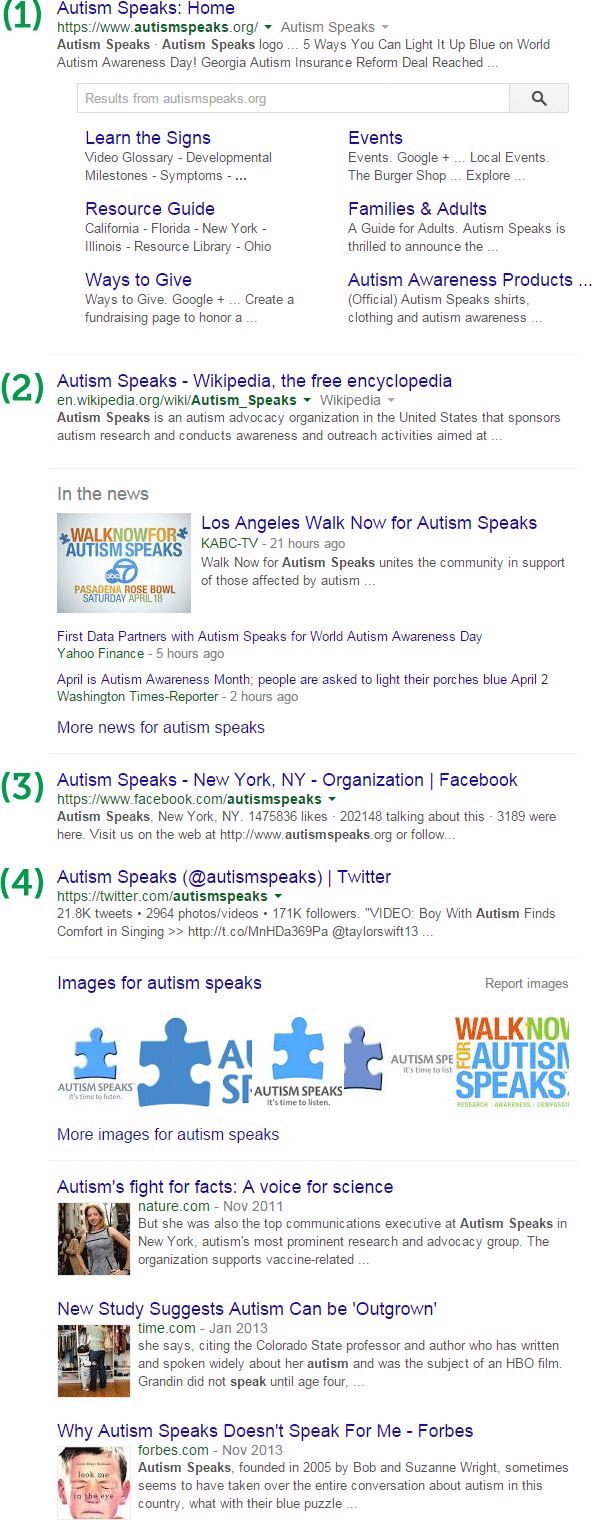In the beginning, there were 10 results, and it was good. Then, came expanded site-links and Google's 7-result SERP. Around the middle of 2014, we started to hear reports of SERPs with odd numbers of organic results – 9, 8, 6, 5, and even 4 page-1 results. At first, these were sporadic and hard to replicate, but they quietly expanded. This is a recent 4-result SERP for "autism speaks":