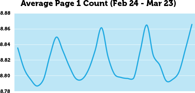 The presence of News results seemed to be cyclical, dipping early in the week and peaking later in the week. I don't follow News results closely, so it was just a curiosity at first, until I saw another bit of data. This is the average page-1 result count for that same period: