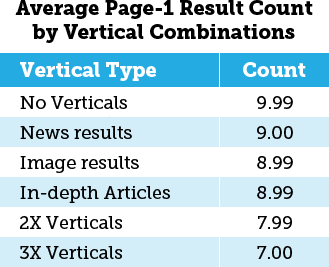 I've taken the average out to two decimal places just to be more transparent, but what we're seeing here is little more than a tiny bit of measurement error. Generally speaking, each instance of a vertical result type (as a whole, not individual links within these verticals) costs a 10-result SERP one organic ranking position. It's worth nothing that SERPs with all 3 verticals are pretty rare, but when they occur, each of those 3 verticals costs one position and one opportunity for you to rank on page 1.