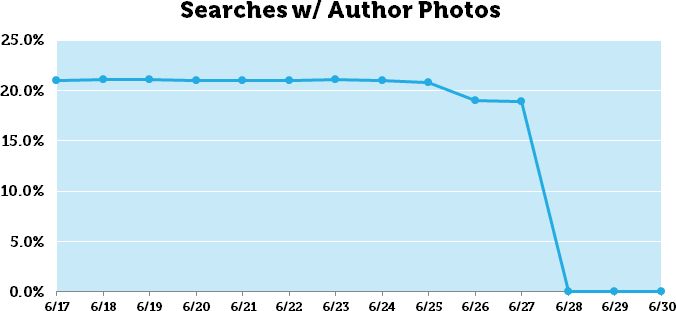 While some authorship photos still appeared in personalized results, the profile photos completely disappeared from general results, after previously being present on about 21% of the SERPs that MozCast tracks. It's important to note that the concept of authorship remains, and author bylines are still being shown (we track that at about 24%, as of this writing), but the overall visual impact was dramatic for many SERPs.