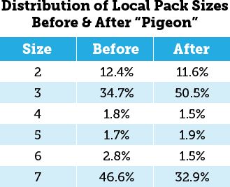 Both before and after Pigeon, there are no 1-packs, and 4-, 5-, and 6-packs are relatively rare. After Pigeon, the distribution of 2-packs is similar, but there is a notable jump in 3-packs and a corresponding decrease in 7-packs. The total number of 3-packs actually increased after the Pigeon update. While our data set (once we restrict it to just searches with pack results) is fairly small, this data does seem to match the observations of local SEOs.