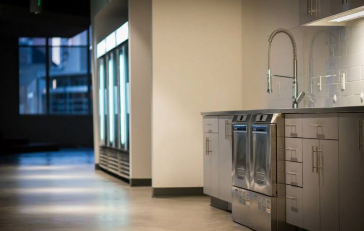Head right, and you'll enter our brand new kitchen! This is definitely one of the things the Mozzers were most excited for. If you ever stopped by the old MozPlex, you'd have noticed that our kitchen was teeny-tiny for the amount of people we had. Lunch started to look like a coordinated dance to get to the refrigerator, use the microwave, or grab a fork. Not anymore! We just might have to move all the tables one day and have a roller-skating party.