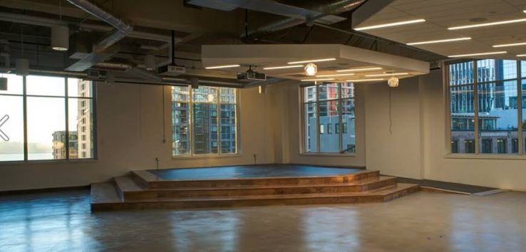 Keep heading through the kitchen and you'll see our stage, which will be home to family meetings (a.k.a. all-staff meetings), lunch-and-learns (last week we learned about commuting to work by bike!), industry meetups, and most definitely lots and lots of karaoke.