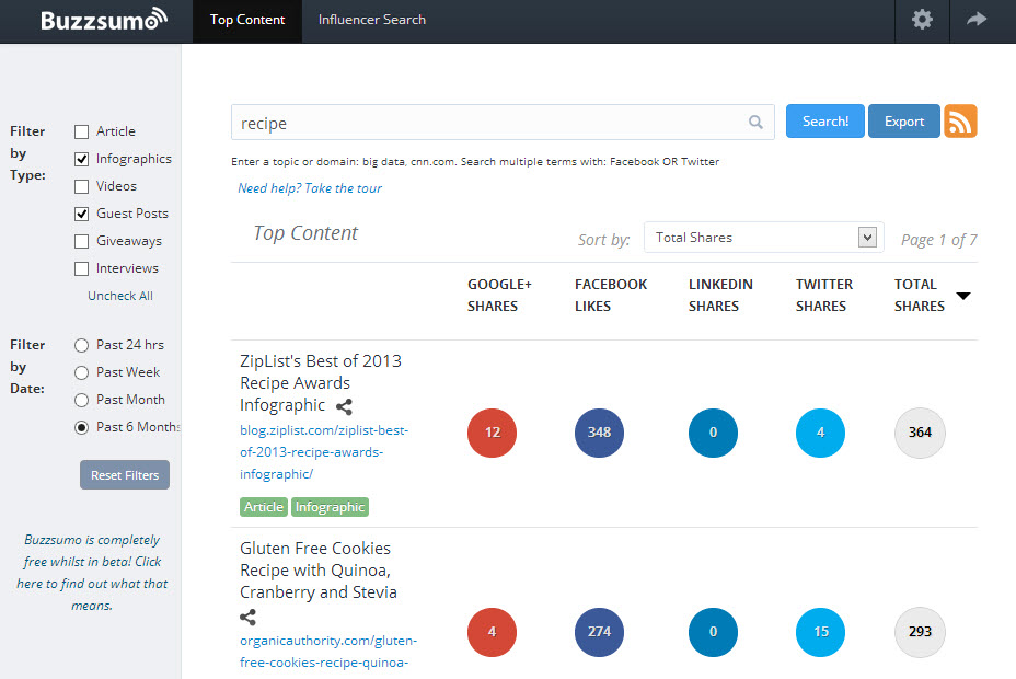 Using the food industry as an example, you can search for "recipe" within BuzzSumo's "top content" search to gather a list of great content.