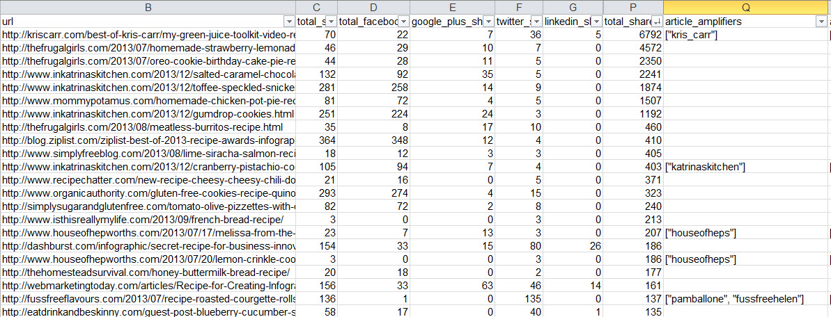 The data that you get within the BuzzSumo export is awesome. Not only do you get a list of the content URLs along with the social shares across each network, but you also get some information on the authors of the content.