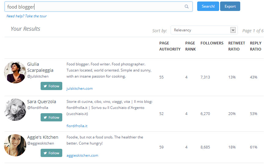 Staying with the example of the food niche, I've typed in "food blogger" into the search bar.