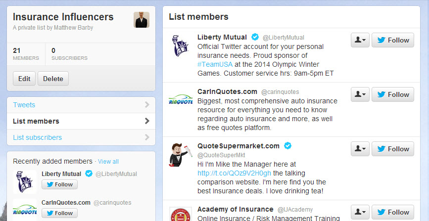 The above screenshot is an example of a list that I use for one of my other clients. If I were you, I'd get in the habit of using Twitter lists because they really do become invaluable over time.