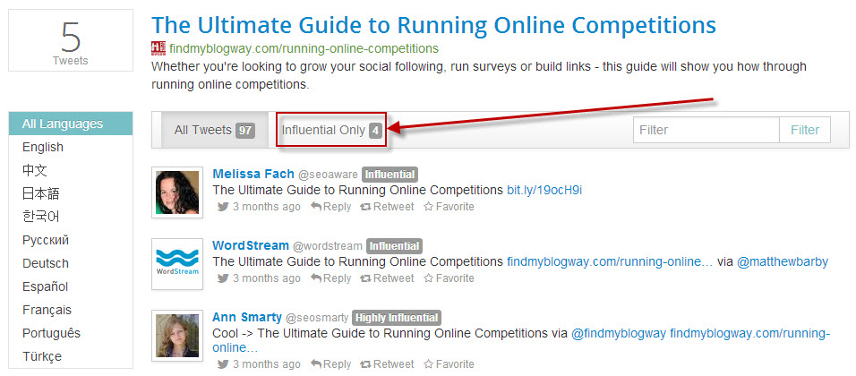 The above screenshot is the output of Topsy's "social search" for my "Ultimate Guide to Running Online Competitions" article.