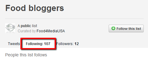 Once you have found a list, you want to click on the "following" tab which brings up the people on the list rather than their tweets -