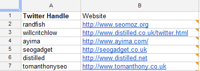 This brings you to a URL such as this one which (if you wanted!) you could scrape the usernames of the list members from. You could then scrape their profiles using something like Google Docs with Xpath and pull out their websites if they have them.