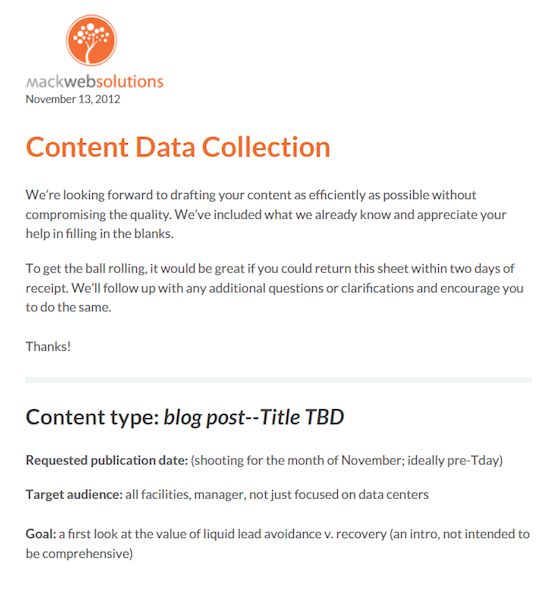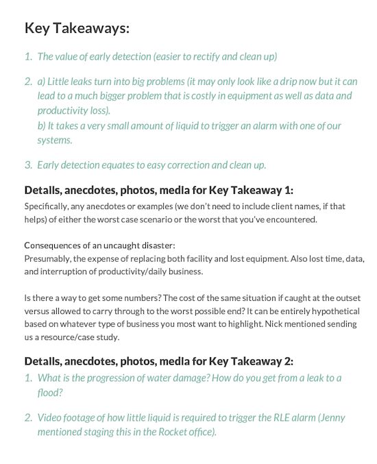 This data collection doc communicates our intent and requests the information we need. The "unless I hear differently" part comes into play in the suggested key takeaways and then asking the client to help us come up with additional details, photos, and anecdotes to support them.