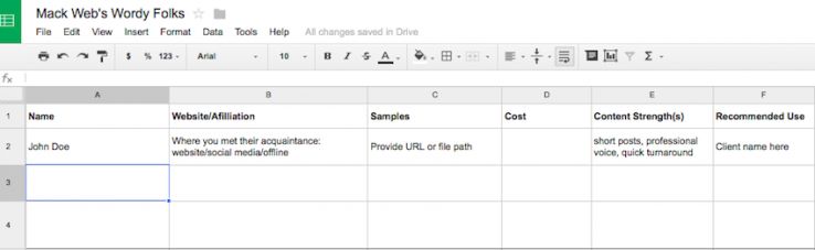 As we're looking for great writers, we use a Google spreadsheet to keep track of the writers that we're interested in working with.