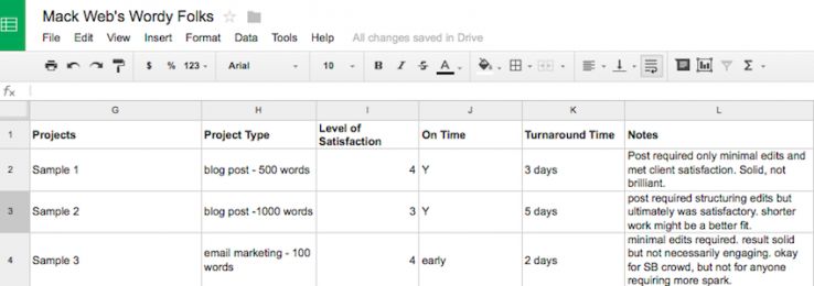 Once we've selected a writer, as they write for our clients, we assess their work. After they complete a few pieces of content for us, we can get a feel for their strengths. We can also identify trends. Do they honor their commitments with us? Do they communicate well? Are they responsive? Are they willing to learn? Maybe they're not a match for the client we have them paired with but they'd be great with another. We use the same Google spreadsheet to keep track of this stuff and also include any patterns we're noticing or feedback we're getting from clients about the content.