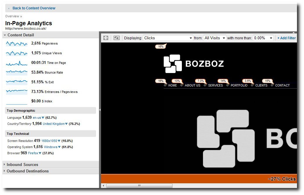 In-Page offers an intuitive visual map that gives instant access to detailed navigation data and in a way that can make necessary on-page optimisation and even web design changes more immediately obvious than trying to mentally map dry data onto the page yourself. This is particularly useful with judicious use of filters, allowing you to quickly see behaviour differences between different demographics.