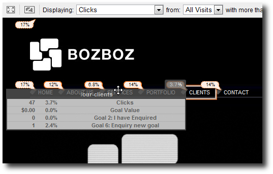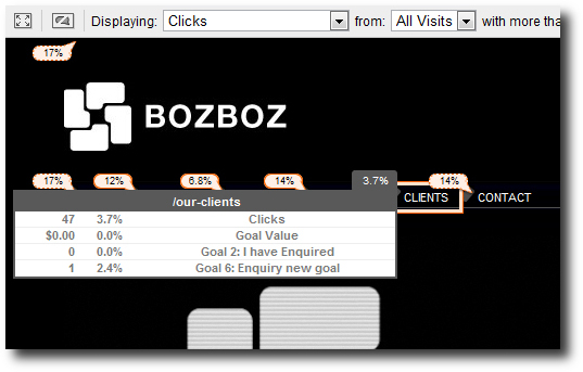 The 'clicks below' feature, which shows a collective percentage of clicks on links below the part of the page you're looking at is particularly useful in tracking vertical drop off in interest. It can be quite revealing as to how much of a difference page location can make to the attention a link gets, and could easily lead to a rearrangement of the page to make sure your best offers (for example) get pride of place.