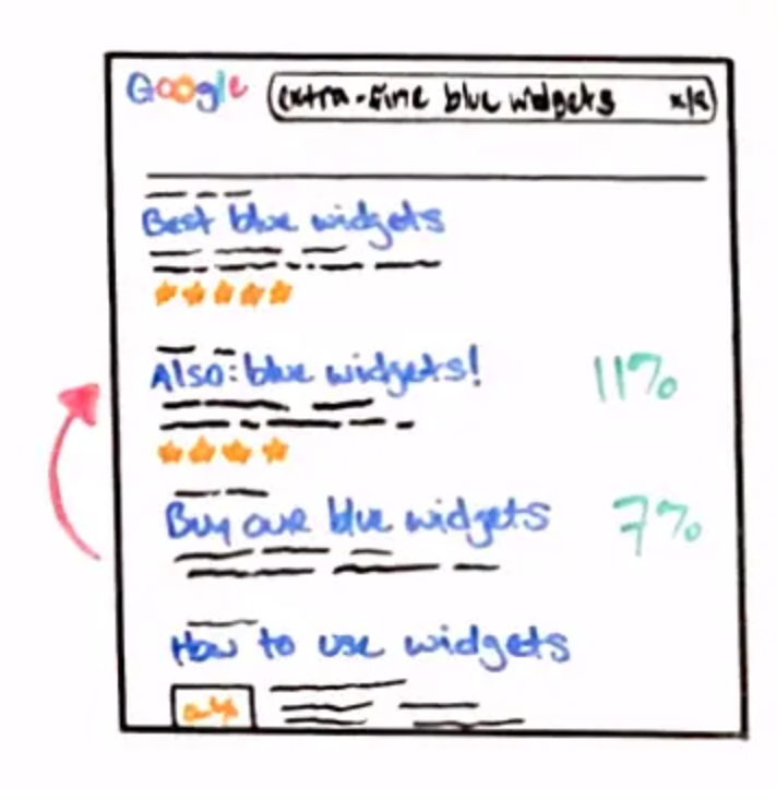 So let's look at our example website, widgets.com, which is currently ranking number three in this SERP for one of their most relevant and lucrative search terms "extra fine blue widgets." So we know that on average the organic click-through rate for a web page that's sitting in the third position on a SERP for a transactional search query like this is about 7%.