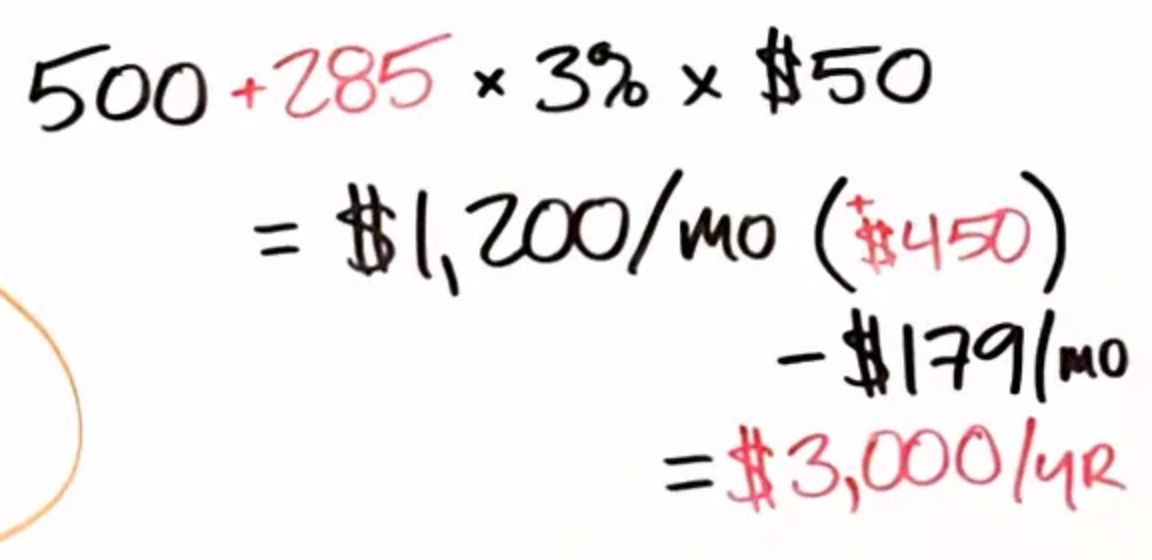 But, of course, we know that Chelsea's good work on that product description and user experience on the page could very well bump up that conversion rate too, which is great. But just to keep it simple, we'll leave that conversion rate constant. It still costs $50 to buy this widget. So now this page is bringing in $1,200 from organic search every month. That is currently a $450 increase per month over when this page was ranking number three. If we take out the cost of the tool that Chelsea is using, we end up with a profit per month of $270, and that works out to about $3,000 in profits per year.