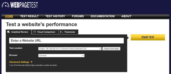 To start go ahead and visit www.WebPageTest.org. It's okay to load this URL on your browser of choice (the browser you visit the URL with is NOT the browser used to run the test, that all happens on the remote server in a controlled environment). If possible, try to use Chrome since some of the more advanced visual tools for displaying the result data work best on Chrome, but it's not a big deal if you'd rather not.
