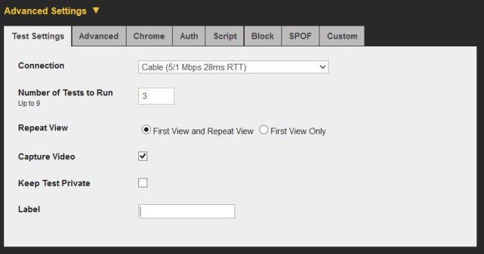 - Number of tests: as the name implies this controls the number of repeat tests to run. This is very important as the Internet can suffer frequent spikes and jitter in response times based on network congestion (see our earlier post on HTTP/2). To get a reliable result, its best to run multiple samples and have WPT automatically choose the median result. We recommend at least three tests, more if you have the time to wait.