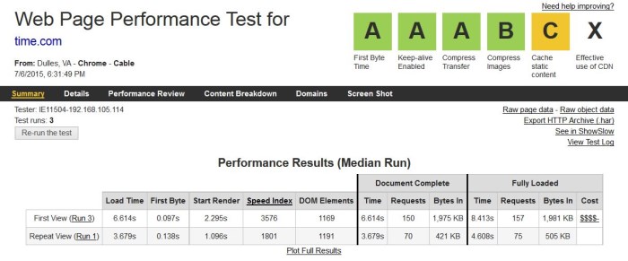 As I mentioned above, this is the median result after 3 runs. You'll also see a breakout of the first page load (no caching by the browser) vs. the repeat page load (browser is now caching some resources). You should almost always expect the repeat view to be faster then the first view. If not, you have some caching problems and should try free tools like PageSpeed Insights and Zoompf to diagnose why your caching is not properly configured.