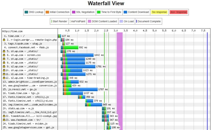 One place WPT really shines is its waterfall charts. Put simply, a waterfall chart is a graph of what resources were loaded by your browser to render a webpage, with the horizontal axis charting increasing time and the vertical axis representing the in-order sequence of loaded resources from top to bottom. In addition, each line in the chart is color coded to capture the various loading and rendering activities performed by your browser to load that resource.