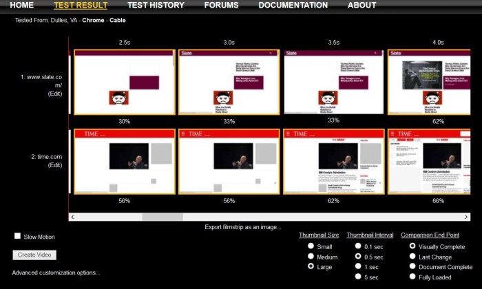 Click compare on the 2 tests of interest and you'll see a cool side by side filmstrip like this: