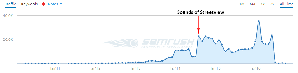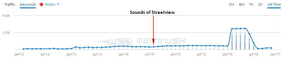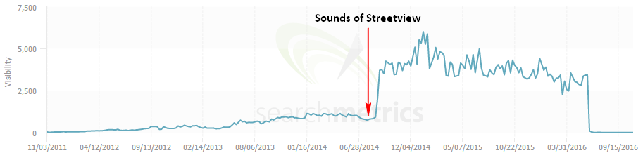 At first glance, there does indeed seem to be a sharp jump in Amplifon’s overall search visibility after the release of the "Sounds of Streetview" on both SearchMetrics and SEMRush. However, upon deeper inspection of SearchMetrics’ keyword-level data (available here), we can see that almost all of this jump has come from new keywords directly related to the "Sounds of Streetview" content piece. Ranking increases and extra traffic from keywords like "street view" and "make your own google" are hardly the kinds of outcomes that businesses yearn for when signing off on large content marketing projects.