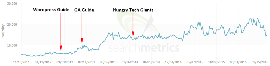 Simply Business has also produced a very successful (in link acquisition terms) suite of business tech guides. Out of a grand total of 20 guides, the two stand-out performers were Wordpress for Small Businesses — released in August 2012, which attracted 1,897 links from 169 linking root domains — and The Small Business Guide to Google Analytics, published in January 2013 and which garnered 3,463 links from 243 sites.