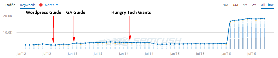 SEMRush Number of Ranking Keywords Graph for SimplyBusiness.co.uk. *SEMRush expanded their tracked keyword set for UK in February 2016, but this jump in keywords does not relate to improved real-life traffic for the website.