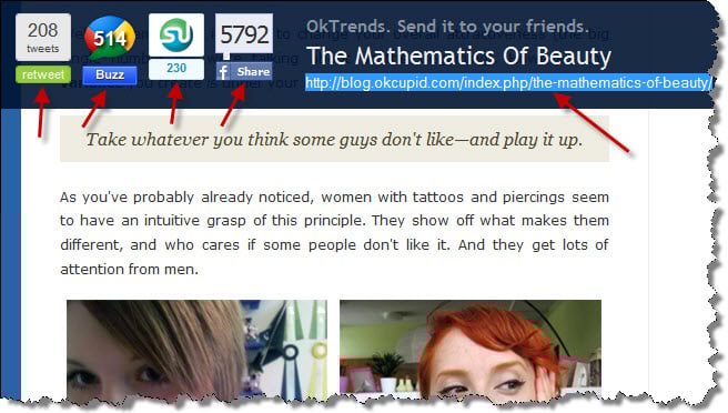 Some content is easy to share in this manner such as infographics, graphs, etc. Take a look at what OkCupid does on their blog. When you reach the bottom of the page, you get this hover over that not only allows you to easily share the content on the social networks, but it gives you an easy way to copy and paste the link.