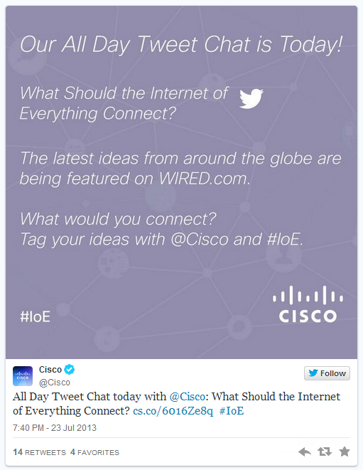 Case in point 05: Cisco takes advantage of the robust and user-friendly Storify platform to feature highlights of its #IoE Twitter chats. They urged users and followers to contribute their thoughts and ideas about The Internet of Everything. Participants with the best idea would be rewarded with the delight of seeing their tweets on WIRED.