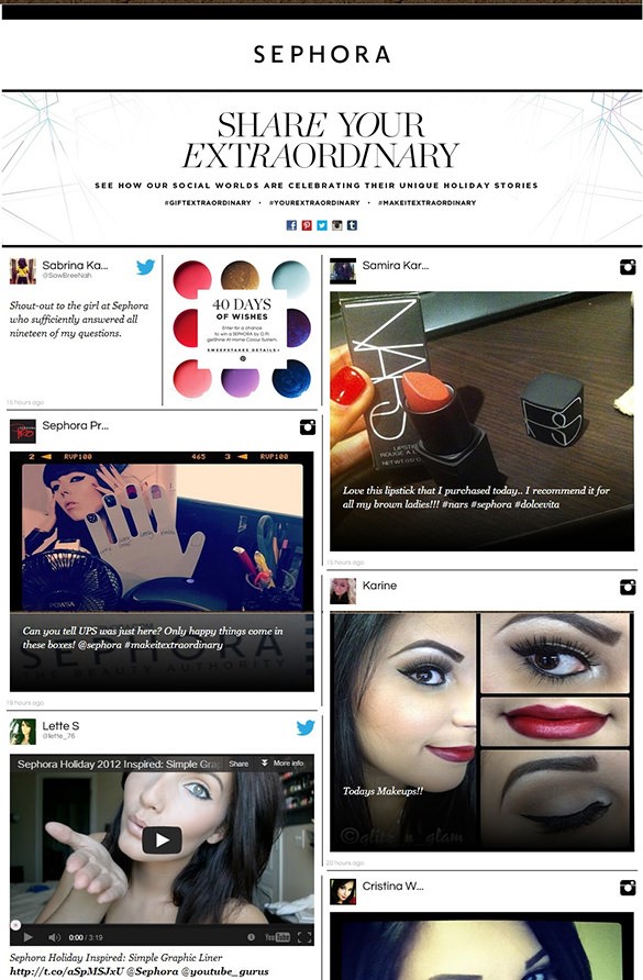 3. Sephora, global cosmetic retailer and social media leader, partnered up with FeedMagnet to curate, aggregate and share content gathered from various social media platforms (think: Facebook, Pinterest, Twitter, Instagram, and Tumblr). They pretty much created a branded social hub through this new form of “social curation”.