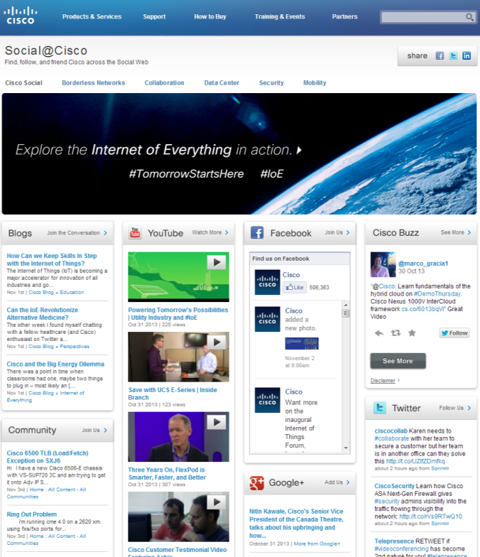 Cisco was one of the earliest tech companies to leverage on the power of content curation. Its Social@Cisco was created so that visitors can “Find, follow, and friend Cisco across the Social Web”. Seven core sections dominate the front page: Blogs, Youtube videos, Facebook, Cisco Buzz, Community, Google+ and Twitter. The latter features an active Twitter stream where visitors can also follow one (or all) of their accounts from departments such as IT, Security, and Mobility as well as personal accounts belonging to top executives.