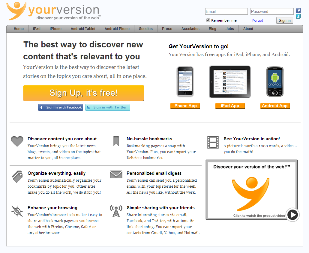 YourVersion is free content curation tool defined as “the best way to discover new content that’s relevant to you”. If you want a great way to filter out unwanted “noise” in your social stream, this is it.