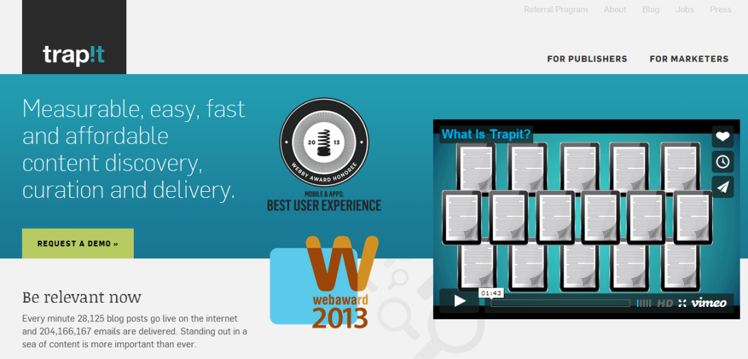 A powerful content discovery, curation and delivery platform, Trap.it has a uniquely built algorithm that provides fast and accurate content recommendations in order to create personalized experiences.