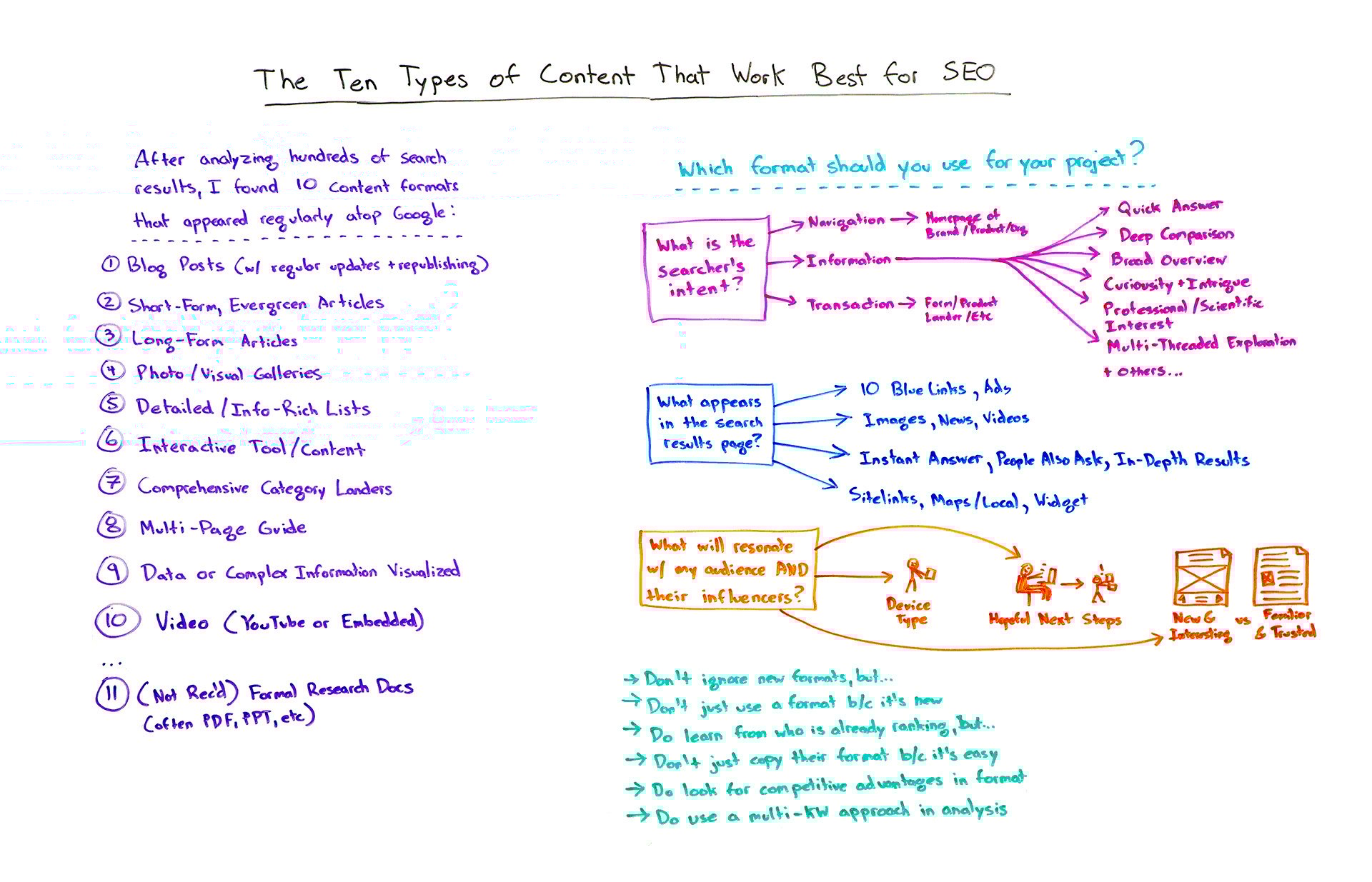 - Do use a multi-keyword approach in this analysis. So when I'm saying, "What is the searcher's intent," I'm asking you to consider all of the words and phrases that you're hoping to rank for with this piece of content, not just a single keyword term or phrase. That will give you the best way to choose the right content format for the search queries and the overall goal of attracting the right searchers.