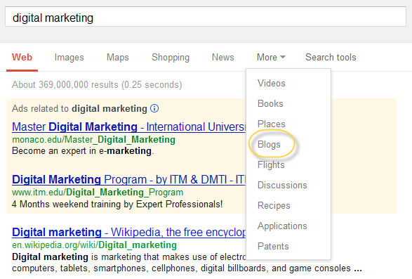 From the Google menu, click “More” and select “Blogs,” then do a search for broad industry keywords