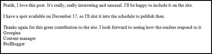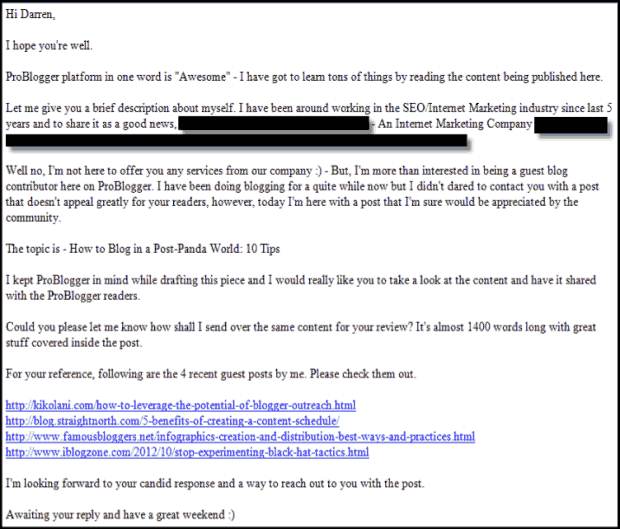 ProBlogger is pretty much the site for professional bloggers, so like SEJ, it's not exactly easy to get a post on the site. Unfortunately, when some people hear this they think their emails need to be perfectly polished and sleek. Well, here's our initial outreach email with ProBlogger: